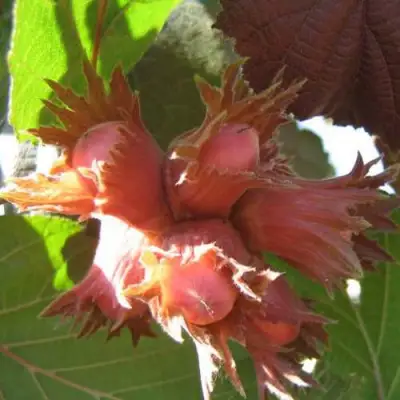 Саженцы фундука «Екатерина» — это краснолистный высокорослый сорт, достигающий высоты до 5 метров. Растение отличается сильнорослым темпом роста и раскидистой кроной со средней загущённостью ветвей. Листья саженца имеют уникальный красный цвет, что придаёт ему особую декоративную ценность. Околоплодники, которые окружают орехи, могут варьироваться от розового до тёмно-малинового оттенка, что ещё больше подчеркивает красоту растения.