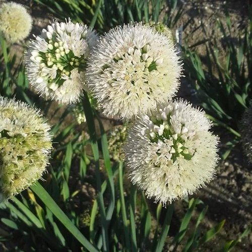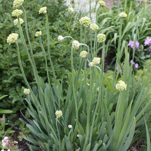 В июле появляются округлые соцветия — плотные зонтики бело-сиреневых оттенков. На высоком цветоносе шар диаметром до 6 см смотрится воздушно и ярко. Цветение длится около месяца, привлекая полезных насекомых, особенно пчёл. Аромат — лёгкий, луково-медовый. Хорошо вписывается в натуралистические и функциональные сады.
