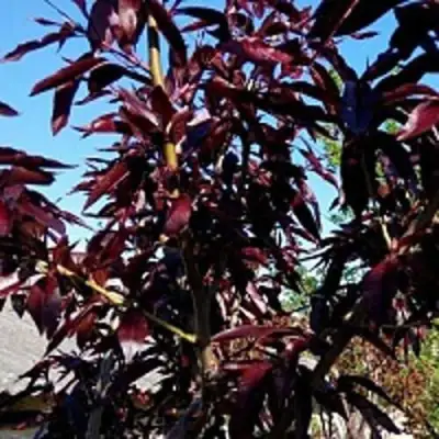 Персик декоративный Бургунди - это среднерослое растение, достигающее высоты около 2-3 метров, удивит вас своей загущенной кроной и насыщенно-красно-фиолетовыми листьями, придающими ему особый шарм в любое время года.