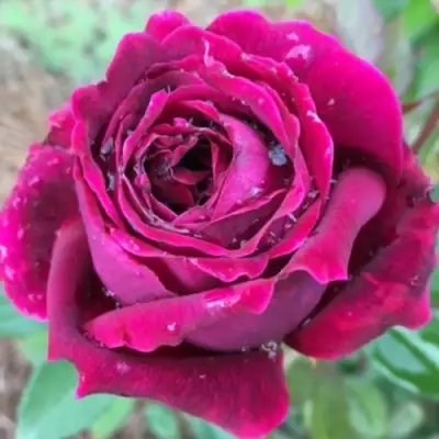Главное достоинство — цветы. Бутон густомахровый, с 30+ лепестками, чашевидной формы. Диаметр раскрытого цветка достигает 10 см. Окрас нестандартный: летом — насыщенный пурпурно-свекольный, ближе к осени темнеет до почти чёрного с рубиновыми бликами. Цветение длится с начала лета до заморозков, волнообразное и равномерное. Один куст даёт 1–3 цветка на стебле. Аромат насыщенный, тёплый, с фруктово-пряными нотами, особенно выражен в утренние часы.